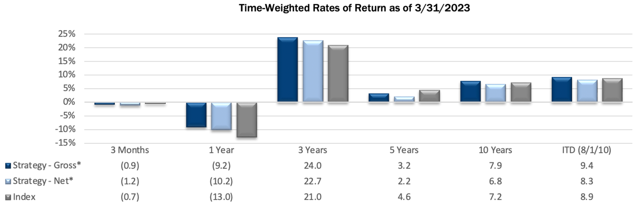 Returns for the Small Cap Value composite are time-weighted and presented gross and net of management fees and other expenses and includes realized and unrealized gains and losses, cash and cash equivalents and related interest income, and accrued based dividends. Net returns are calculated by deducting the highest annual management fee of 1.00% from the quarterly gross composite return. Performance-based fees are available upon request. All returns are calculated after the deduction of the actual trading expenses incurred during the period.