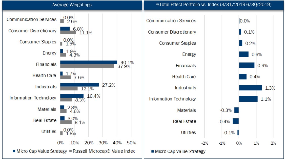 The Pacific Ridge Capital Partners’ Micro Cap Value strategy rose 5.4%* during the second quarter of 2019, outperforming the 1.4% return of the Russell Microcap® Value Index (“Index”). Over the trailing one-, three- and five and ten-year periods, the strategy returned -11.0%*, 16.7%*, 11.7%* and 18.3%* (annualized), respectively, compared to the Index returns of -10.9%, 12.2%, 6.3% and 13.0%. Since inception on April 1, 2007, the strategy returned 10.7%* annually versus 5.0% for the Index.